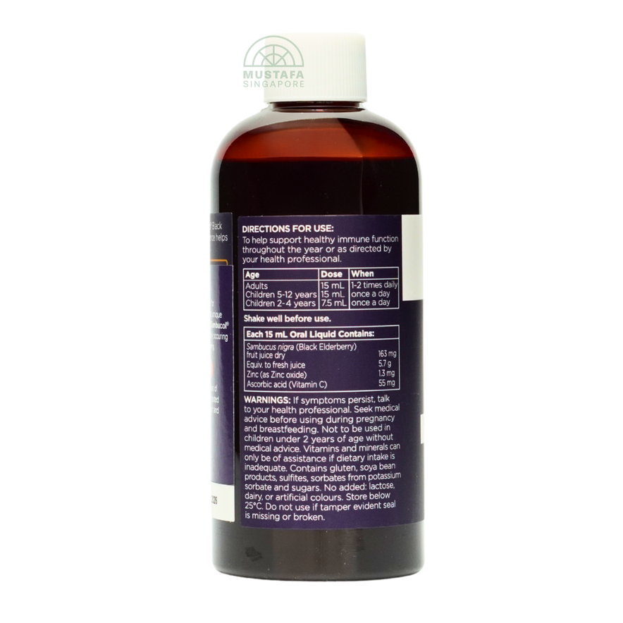 Active ingredients per 15 mL oral liquid: Sambucus nigra (black elderberry) fruit juice dry 163 mg (equivalent to fresh juice 5.7 g), ascorbic acid (vitamin C) 55 mg, zinc (as zinc oxide) 1.3 mg