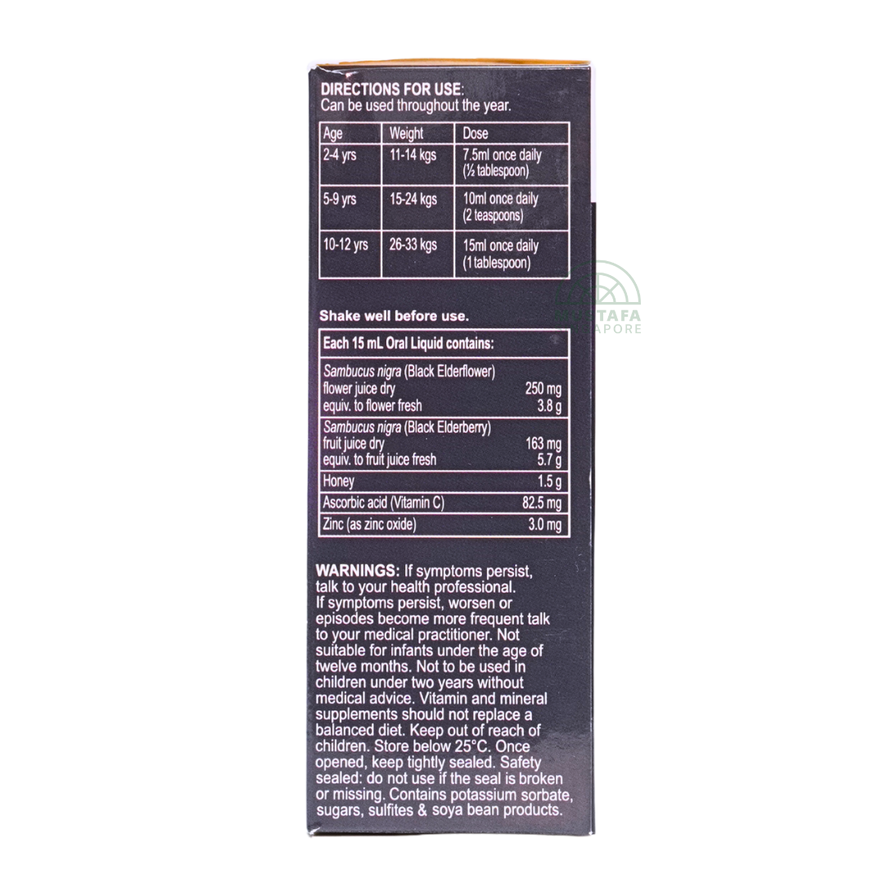 Sambucus nigra (Black Elderberry) fruit juice dry equivalent to fresh juice, Vitamin C (Ascorbic Acid), Zinc (as Zinc Gluconate), sweeteners (such as sorbitol), natural flavours, purified water.