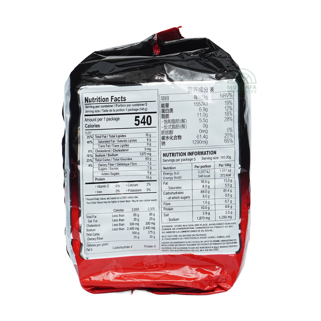 Wheat flour, potato starch, refined palm oil, seasoning (soy sauce powder, sugar, salt, chilli extract, garlic powder, onion powder, yeast extract, flavour enhancers), vegetable flakes, stew broth seasoning, emulsifiers, acidity regulators.