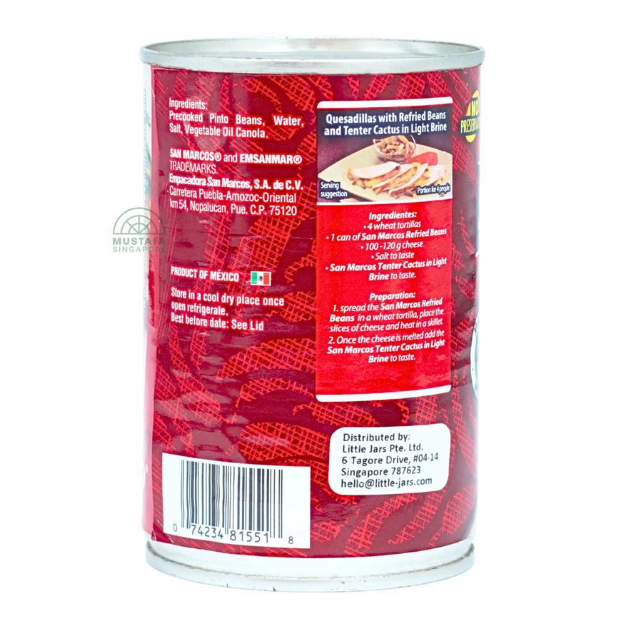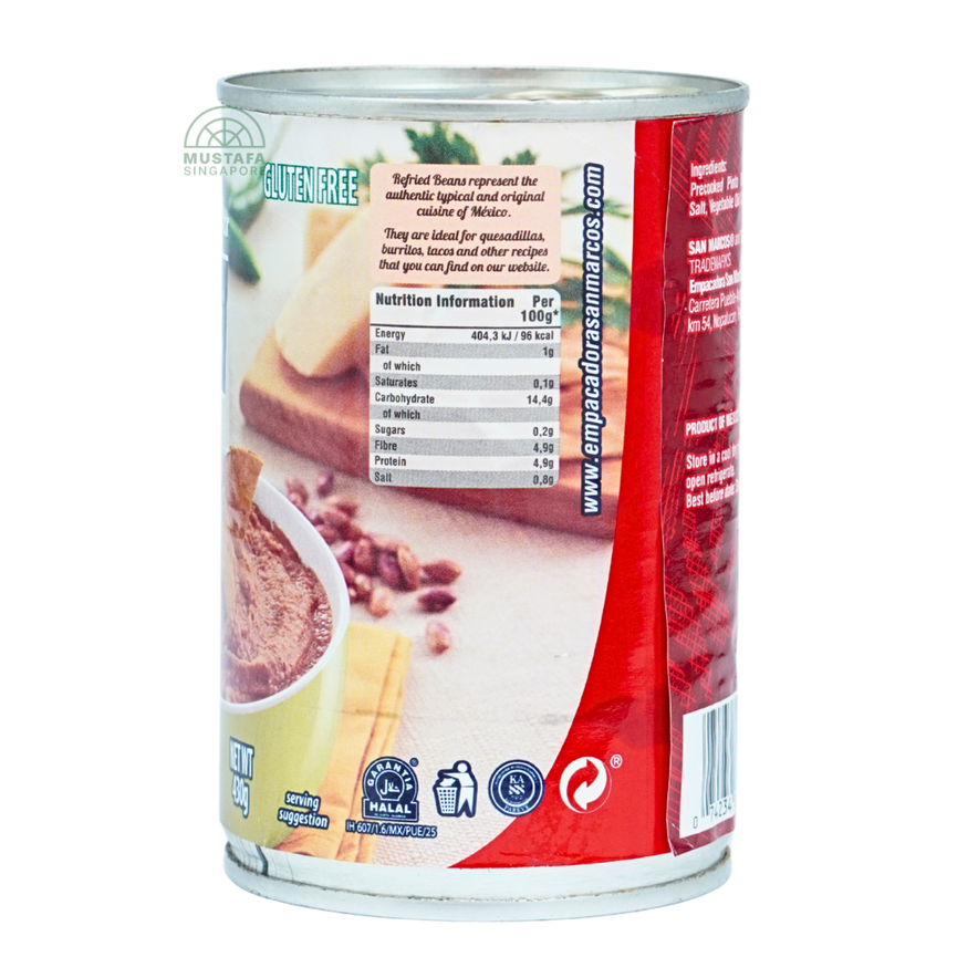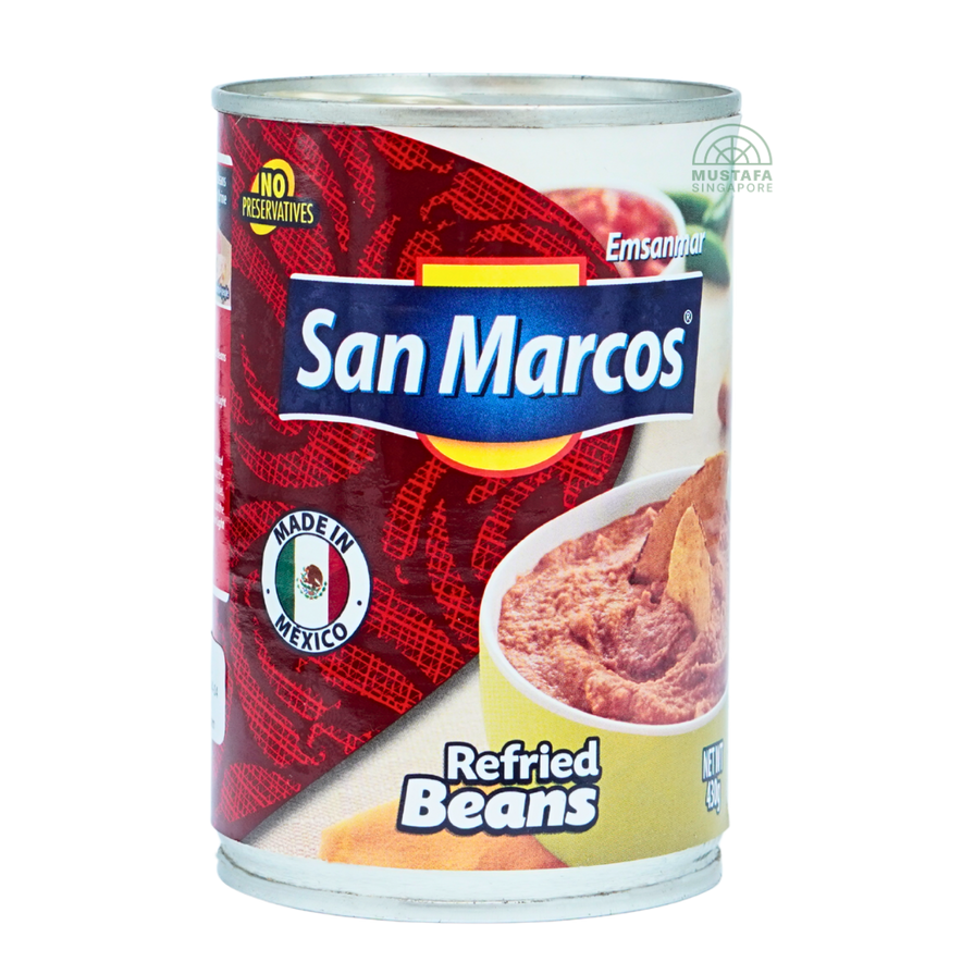 San Marcos Refried Beans are made from cooked and mashed pinto beans, seasoned to deliver authentic Mexican flavour and creamy texture. Perfect as a side dish, taco filling, or dip, they bring both convenience and traditional taste to your table.