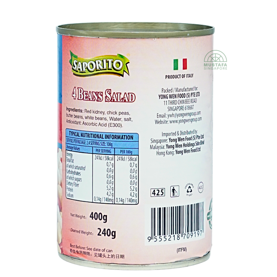 Saporito 4 Beans Salad is a wholesome mix of beans, carefully cooked and packed to preserve their natural taste and texture. A versatile ingredient, it is perfect for salads, soups, casseroles, and healthy vegetarian dishes.