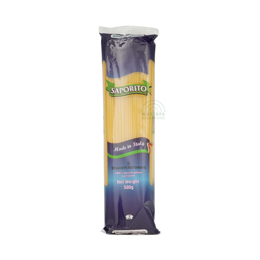 Saporito Spaghetti 500g is premium-quality durum wheat pasta with a classic long strand shape, ideal for Italian dishes such as aglio olio, carbonara, and tomato-based sauces.
