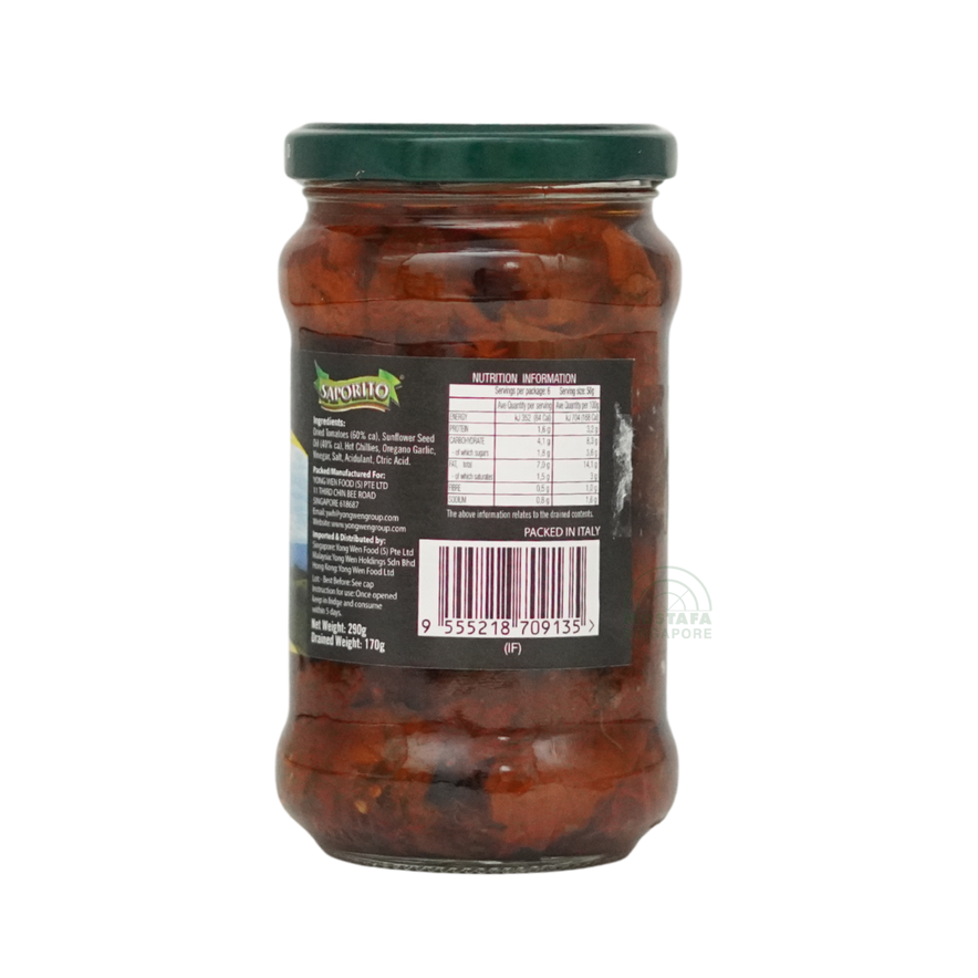 Saporito Sundried Tomato in Sunflower Oil 290g features richly flavoured tomatoes preserved in sunflower oil, ideal for pasta, salads, and antipasti.