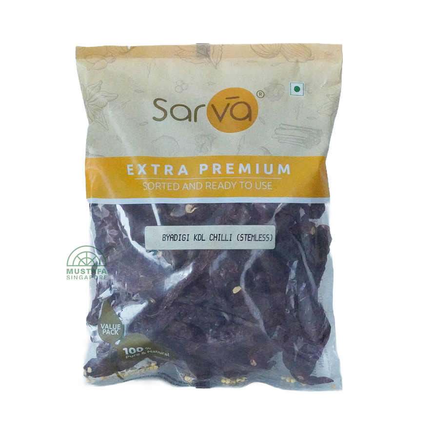 Sarva Byadigi KDL Chilli (Stemless) delivers a deep red hue and subtle spice, ideal for tempering and curry bases.