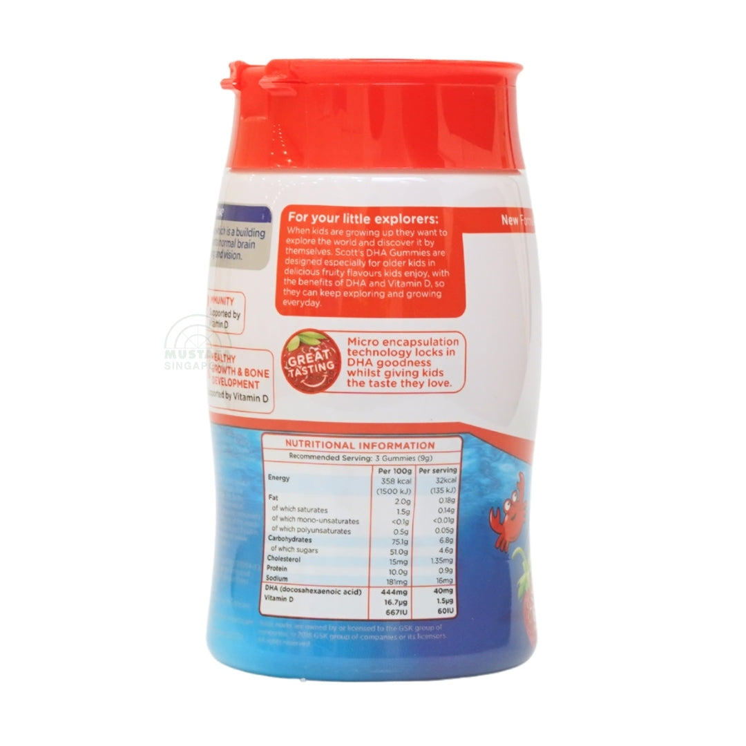 Tasty brain support for growing kids. Scott’s DHA Gummies in strawberry flavour combine essential omega-3 DHA and vitamin D to support healthy brain development, vision, and immune function. Designed with kids in mind, these gummies are fun to chew, delicious, and free from any fishy aftertaste.