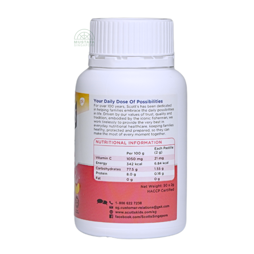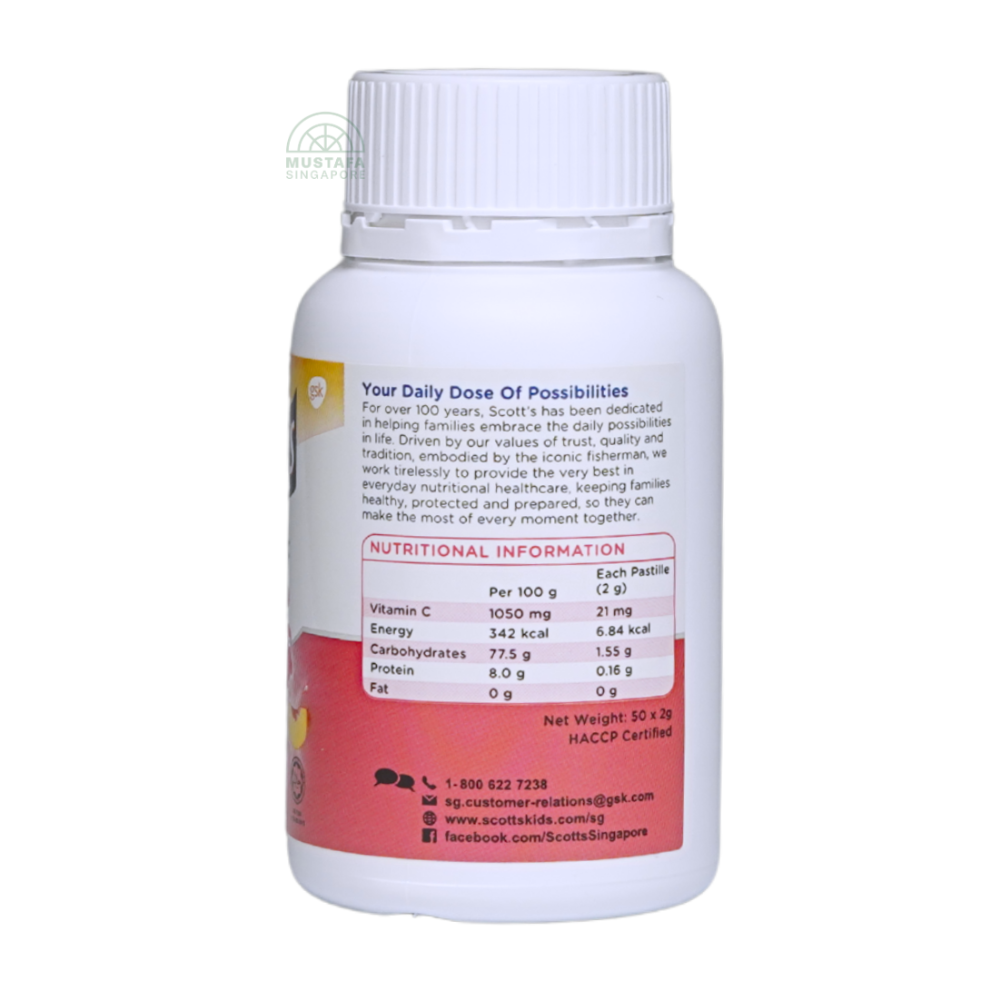 SCOTT’S Vitamin C Peach Pastilles offer a delightful and convenient way for children to meet their daily Vitamin C needs. Each pastille is enriched with natural peach juice and provides 21 mg of Vitamin C, aiding in immune support and overall health. These halal-certified pastilles are suitable for children aged 3 years and above.
