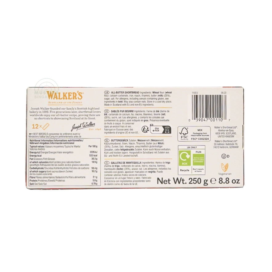 Walker’s Shortbread Fingers are a beloved classic, crafted in Scotland using a traditional family recipe passed down for over 100 years. Made with only the finest natural ingredients, these all-butter shortbread fingers deliver a distinctive crumbly-yet-crunchy texture and rich, buttery taste. Perfect for everyday enjoyment, special occasions, or gifting, Walker’s Shortbread is a timeless treat that brings heritage and quality to every bite.