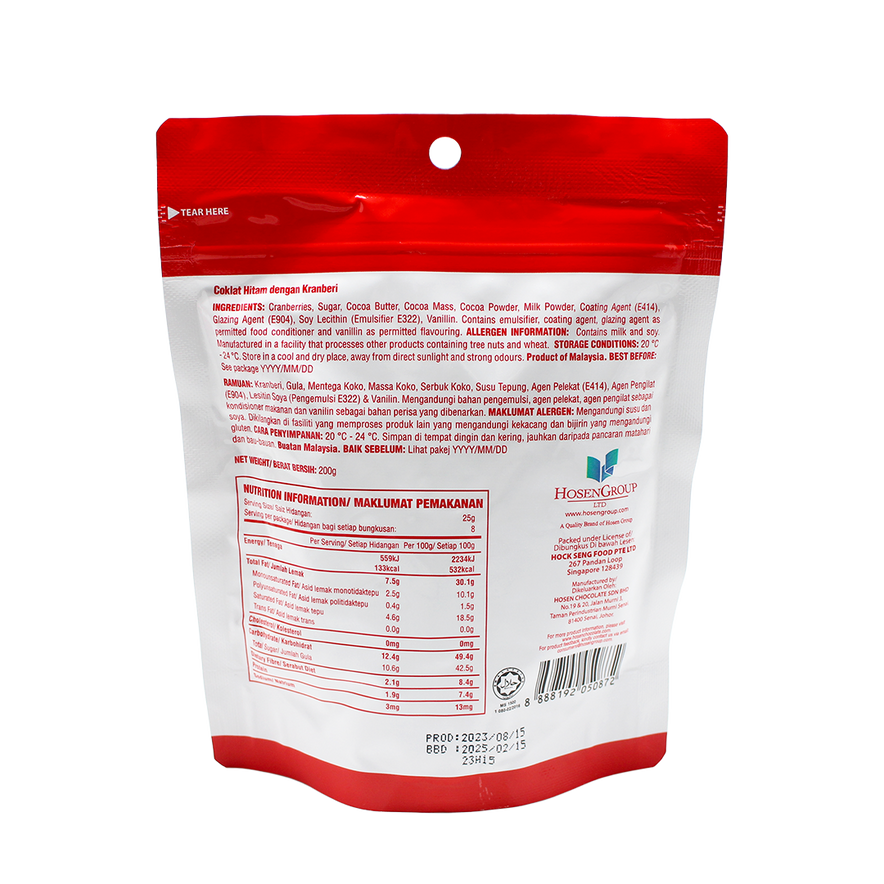 Sincero Premium Dark Chocolate Cranberries 200g feature tangy dried cranberries coated in smooth dark chocolate for a perfectly balanced sweet and tart indulgence. Made with quality cocoa and real fruit, these treats are ideal for snacking, gifting, or enjoying as a delightful after-meal dessert.