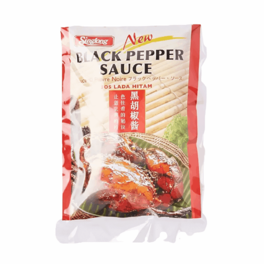 Singlong Black Pepper Sauce delivers a robust peppery kick. Ground black pepper is combined with garlic, onion, soy sauce and spices for a savoury stir-fry or dipping sauce.