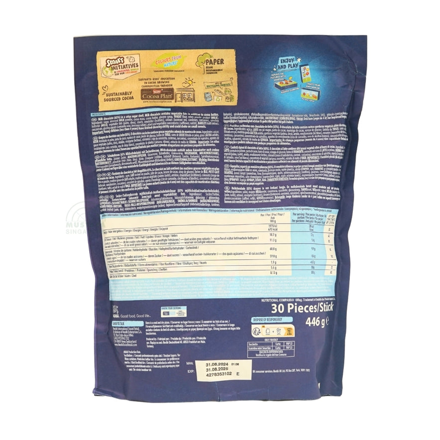 Sugar, cocoa butter, skimmed milk powder, cocoa mass, lactose and whey protein (from milk), wheat powder, butterfat (from milk), rice starch, emulsifier (sunflower lecithin), fruit and vegetable concentrates, carnauba wax, beeswax, natural vanilla flavouring, invert sugar syrup.