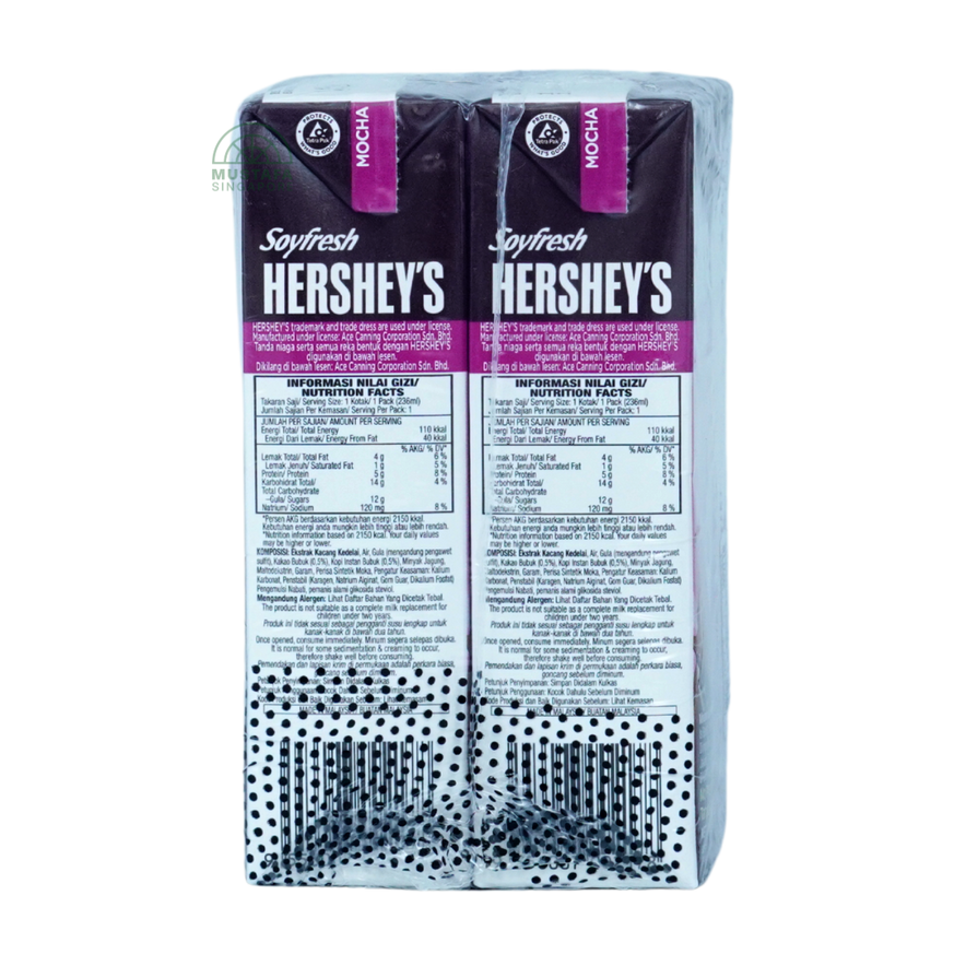 Indulge in the delightful fusion of rich chocolate and aromatic coffee with Soyfresh Hershey's Mocha Flavoured Soya Milk. This dairy-free beverage combines the finest Hershey's cocoa with a hint of coffee, blended seamlessly with smooth soya milk. It's a perfect choice for those seeking a creamy, flavorful drink without the lactose. Whether enjoyed chilled as a refreshing snack or used in your favorite recipes, this mocha-flavored soya milk offers a deliciously satisfying experience.