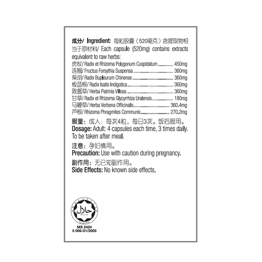 Avoid smoking, alcohol, spicy, raw or greasy foods while taking this remedy. Do not combine with tonic Chinese medicines. Consult a physician if you have hypertension, heart, liver or kidney disease, diabetes, are elderly or frail, or if you are pregnant or breastfeeding. Seek medical attention for fever above 38.5 °C or if symptoms persist more than 3 days.