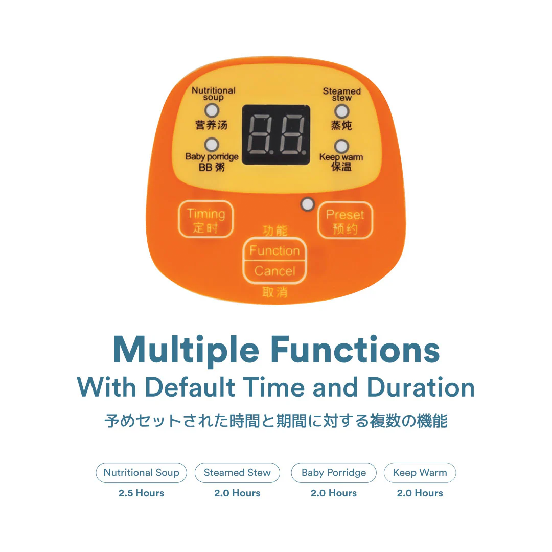 Special Functions of Baby Porridge (2.0hours), Nutritious Soup (2.5hours), Steaming (2.0hours), and Stewing (2.0hours) to meet various demands of stewing