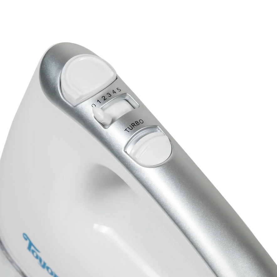 The Toyomi Hand Mixer HM 711 is a versatile kitchen appliance designed to streamline your baking and cooking tasks. Equipped with a 300W motor, it offers 5 speed settings plus a turbo function, allowing you to mix ingredients to your desired consistency. The mixer comes with two chrome beaters and dough hooks, making it suitable for a variety of tasks from beating eggs to kneading dough. Its ergonomic design ensures comfortable handling, and the included unbreakable PC storage case keeps all components organized and easily accessible.