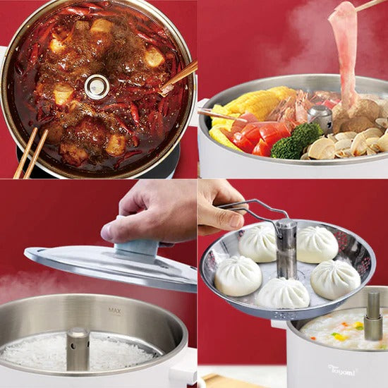 The Toyomi Up and Down Smart 2.5L Steamboat SSB 6625 is a versatile and innovative kitchen appliance designed to enhance your dining experience. It features a stainless steel tray layer that moves up and down with a touch of a button, allowing you to lower the tray with food ingredients to cook in the soup and raise the tray when your ingredients are done cooking. This design ensures hygienic handling and prevents cross-contamination, making it perfect for sharing steamboat meals with 2–4 people. Additionally, the steamboat offers a "Low-Carb Rice" function that allows you to cook rice while separating carbohydrates and impurities, resulting in healthier rice in just 20 minutes. With a powerful 1500W heating element, food is ready in just 6 minutes. The appliance also features a cool-touch body for scald-free handling, an SUS 304 stainless steel inner pot and layer, a touch screen to select functions, and overheating protection with auto cut-off when dry boiling is detected. The compact design makes it ideal for small families or gatherings.