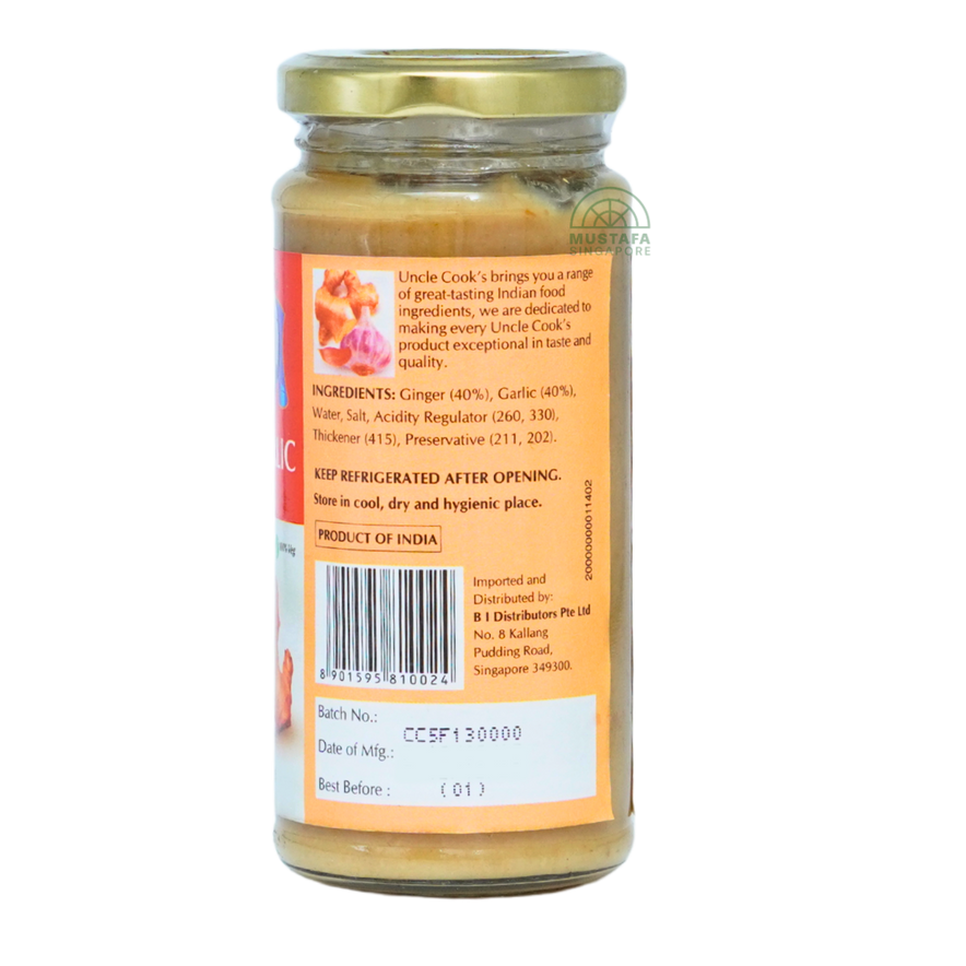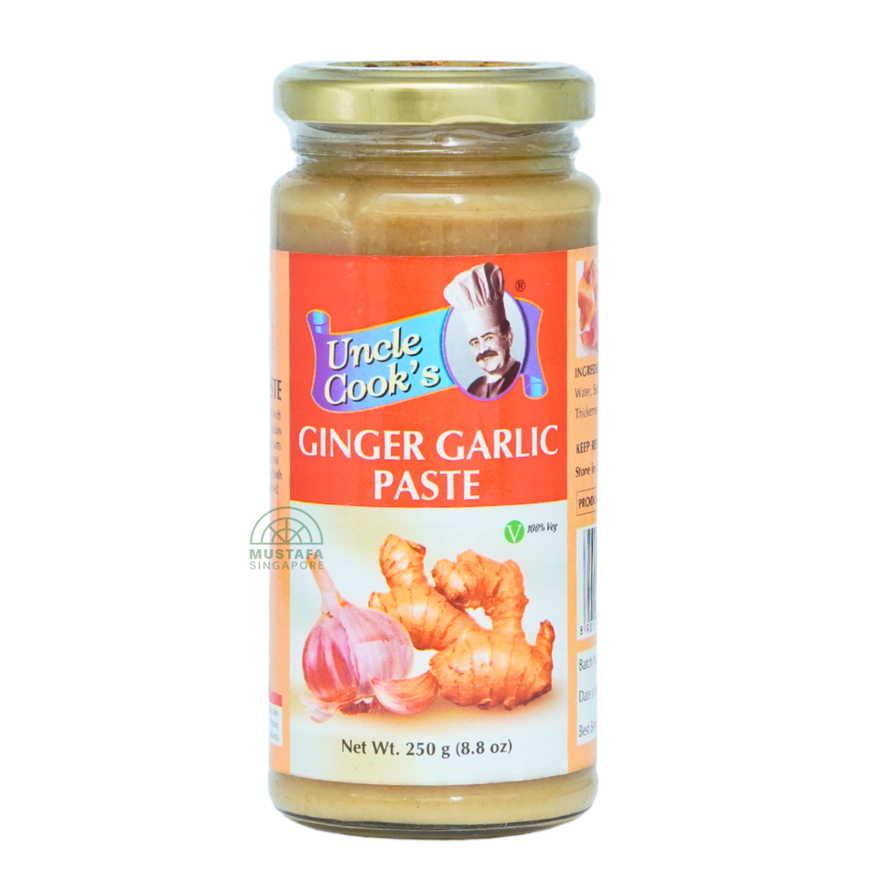 Uncle Cook's Ginger Garlic Paste 250g blends fresh ginger and garlic for an aromatic and flavorful base, ideal for curries, stir-fries, and marinades.