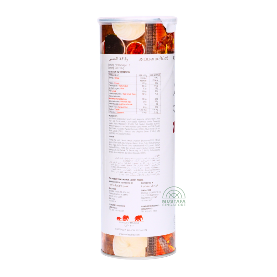 Letil, Baking Soda(sodium bicarbonate), Vegetable oil(Palm Olein), Rice, Flour, Salt, Cumin seeds, Carom seeds, Asafoetida powder, Seasoning powder, Sugar, Maltodextrin (E1400), Salt, Sodium Diacetate (E262(i)), Herbs and spices such as Onion Powder, Garlic Powder, and Chilli Powder, Yeast Extract, I+G(E635), Paprika Oleoresin, (E160c), Allura Red (E129) and Silicon Dioxide (E551), Natural colour (Paprika Extract (E160c)), Citric Acid(E330), and Capsicum Extract.