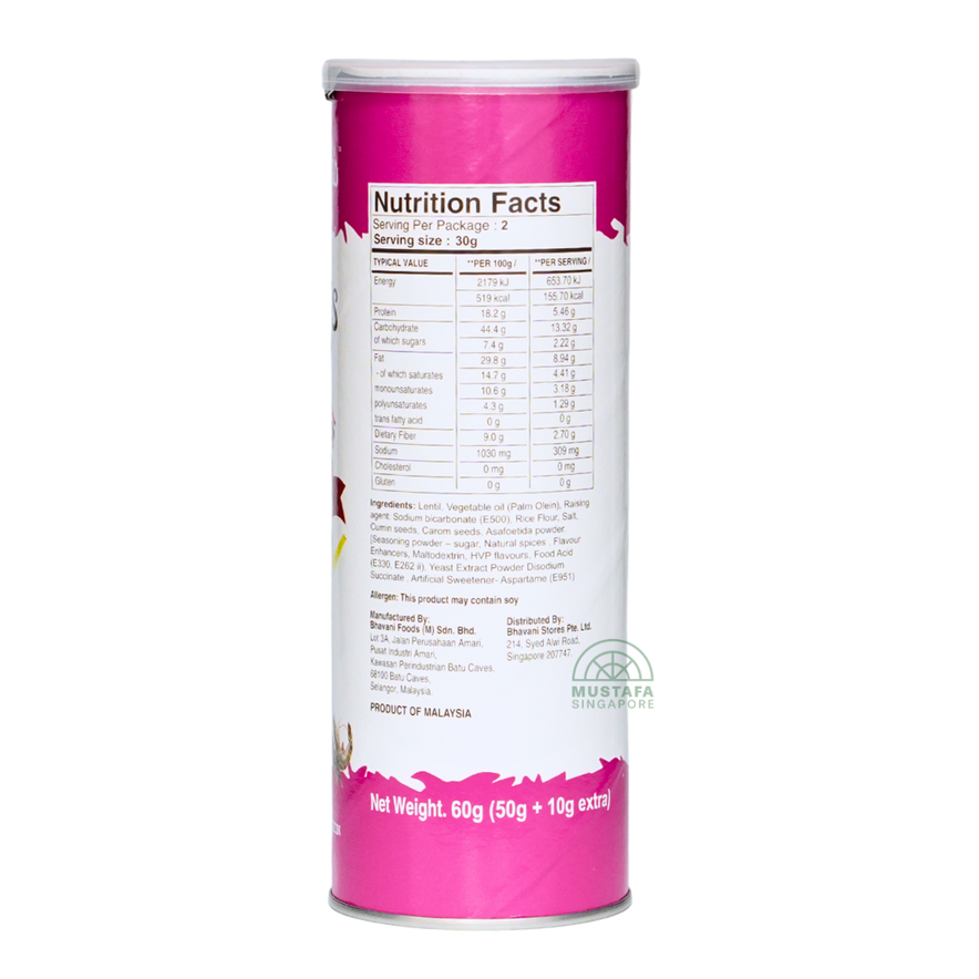 Lentil flour, chickpea flour, vegetable oil (palm olein), raising agent (INS550), rice flour, cumin seed, salt, sugar, maltodextrin, spice mix (garlic, pepper, paprika), tomato powder, acidity regulators (INS330, INS262(i), INS260, INS296), hydrolyzed vegetable protein (soy), flavors, flavor enhancer (yeast extract powder, INS627, INS631), anticaking agent (INS551).