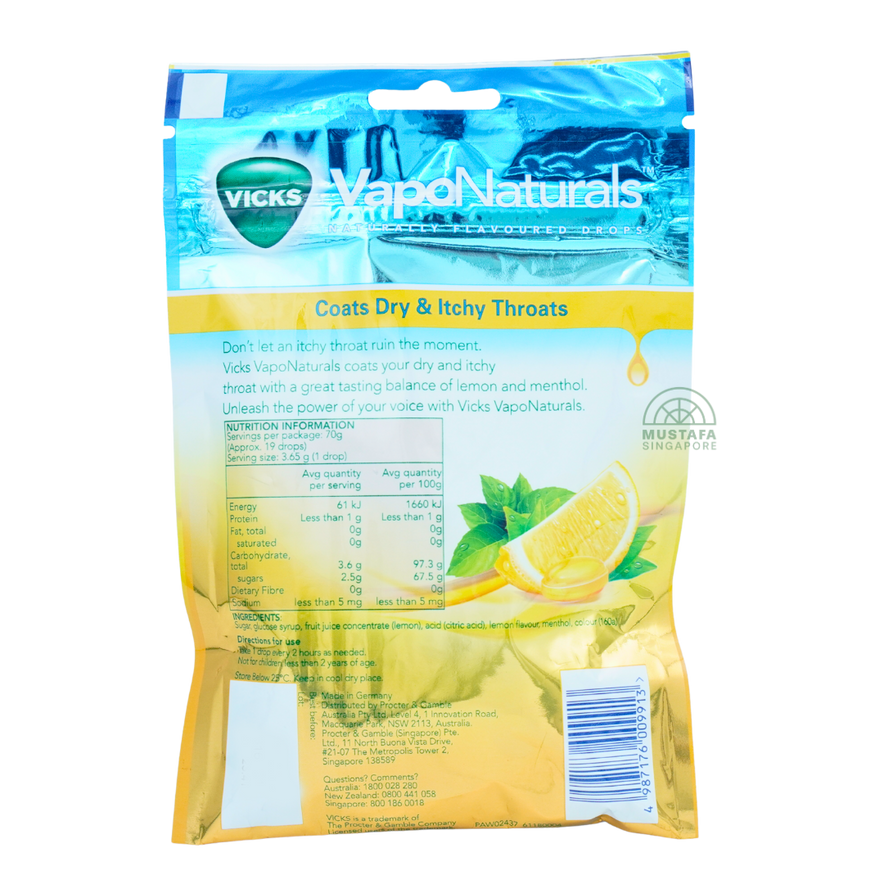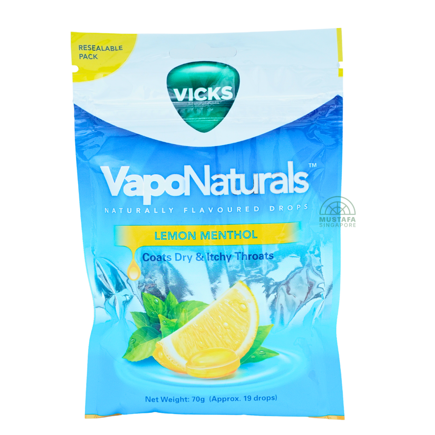 Vicks VapoNaturals Lemon Menthol Drops are naturally flavored lozenges designed to soothe dry and itchy throats. Combining the refreshing taste of lemon with the cooling effect of menthol, these drops provide comfort and relief when your throat feels irritated.