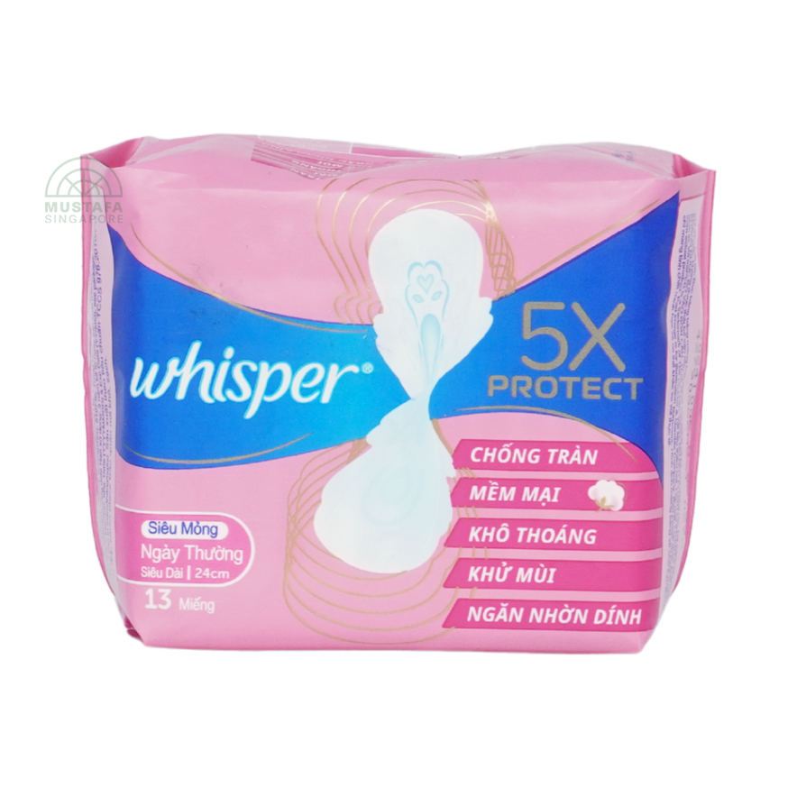 Whisper 5x Protect Thin Regular Wings (24 cm) provides dependable protection for regular flow days. The pad features instant absorbent and anti-spill technology with gel beads that absorb rapidly while remaining slim. Its 24-cm length and wings hug underwear for a secure fit, while the breathable cottony surface and flexible core deliver comfort.