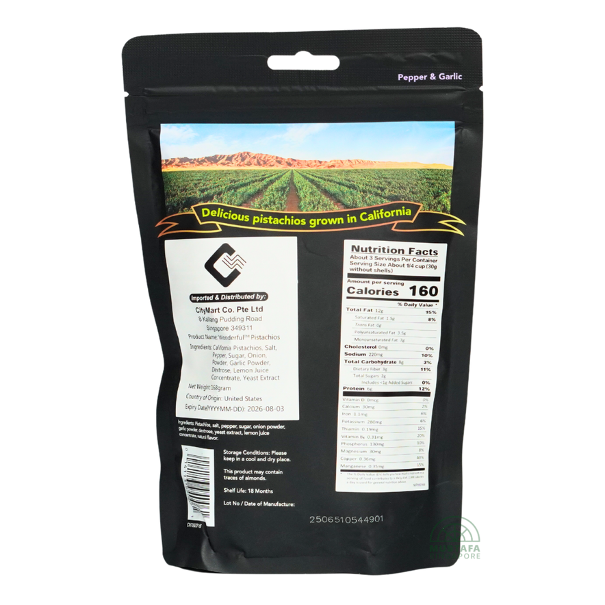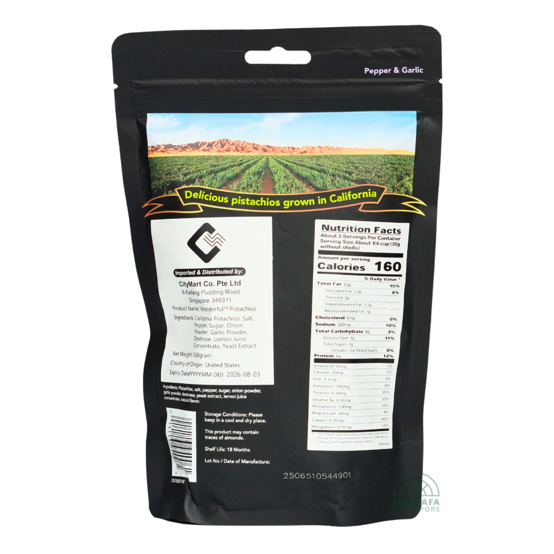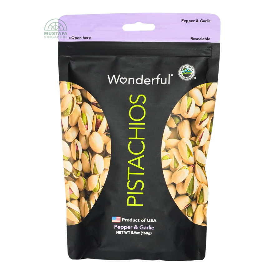 Elevate your snacking experience with Wonderful Pistachios Pepper & Garlic. These California-grown, in-shell pistachios are expertly roasted and seasoned with a vibrant blend of salty, savory, and aromatic flavors, including black pepper, garlic, and a hint of tang, to make every bite irresistibly bold and satisfying. Naturally gluten-free, Non-GMO, and plant-based, they’re a flavorful, protein-rich snack that balances indulgence with wellness.