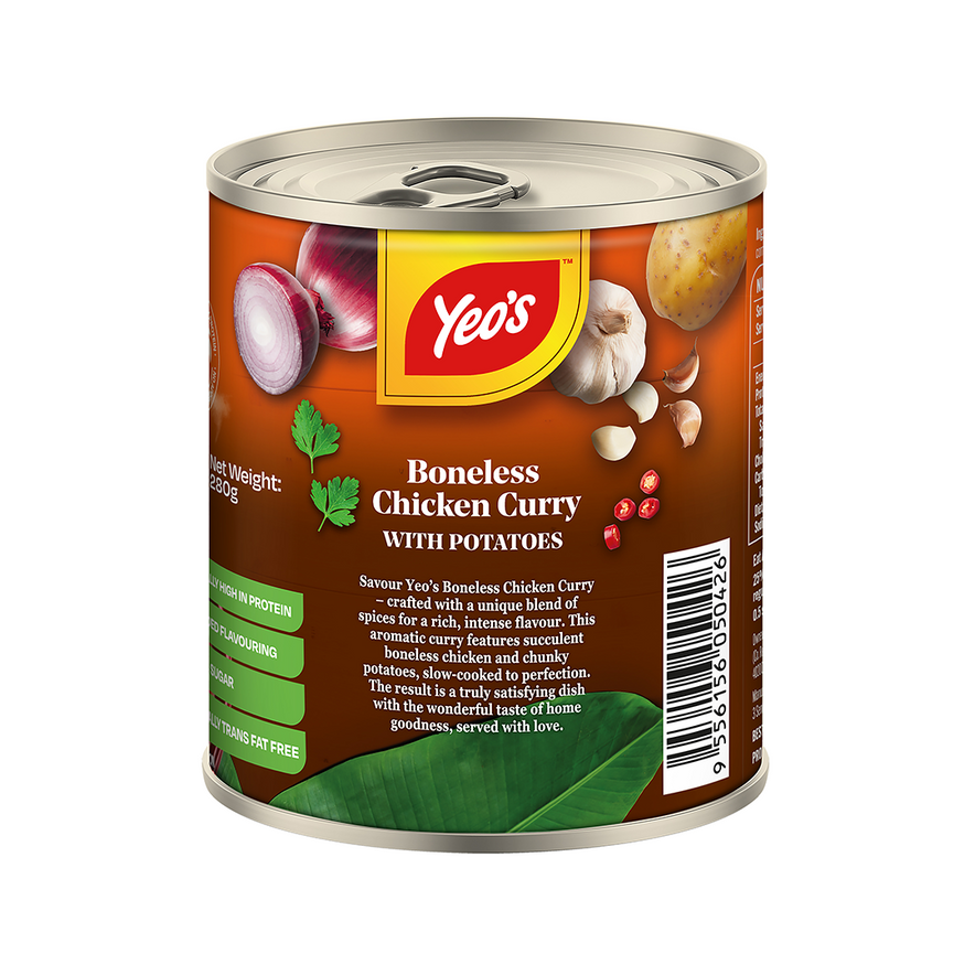 Savor Yeo's Chicken Curry (Boneless), a deliciously rich Malaysian curry made with boneless chicken simmered in creamy coconut milk and spices like lemongrass, galangal, and turmeric. This ready-to-eat curry offers a flavorful, hearty meal that's perfect for pairing with rice, noodles, or bread.