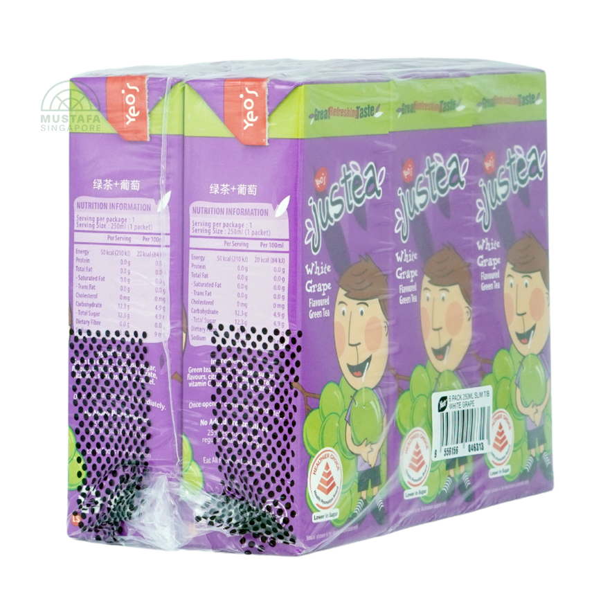Delight in the refreshing fusion of green tea and white grape with Yeo's Justea White Grape Green Tea. This beverage combines the delicate taste of green tea with the sweet, fruity notes of white grape, offering a unique and enjoyable drink. Each serving is enhanced with chewy aloe vera bits, adding a fun texture to your refreshment. Perfect for those seeking a light and flavorful drink, it's halal-certified and made in Malaysia.